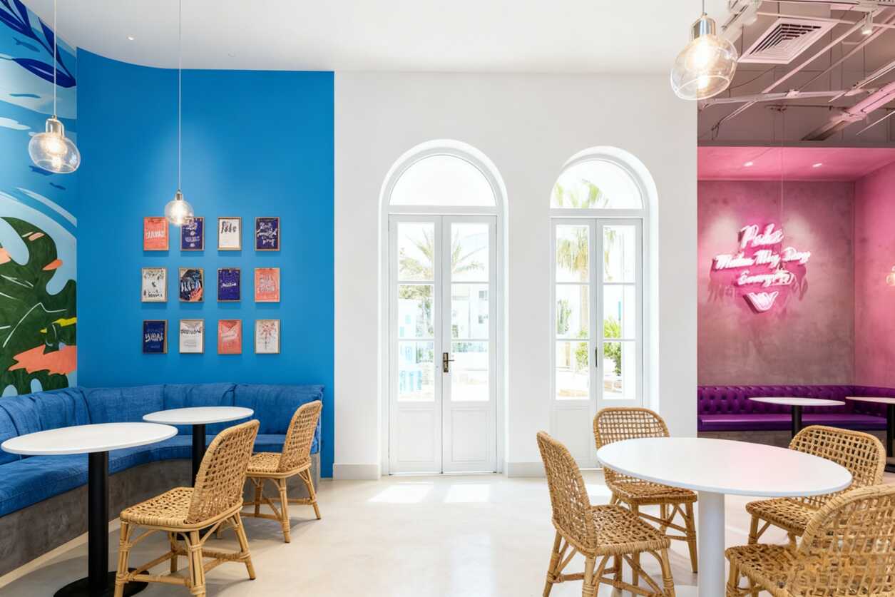 寶子們,這家專做波奇飯的“Poke-d”餐廳真是把我拿捏住了!一進(jìn)門就被整面藍(lán)色主題墻吸住眼球——翠綠棕櫚葉+躍動大魚圖案直接帶你瞬移夏威夷海邊,中間那個“Poke-d”logo設(shè)計得賊有辨識度,海洋氛圍拉滿不說,拍照當(dāng)背景板簡直一絕!