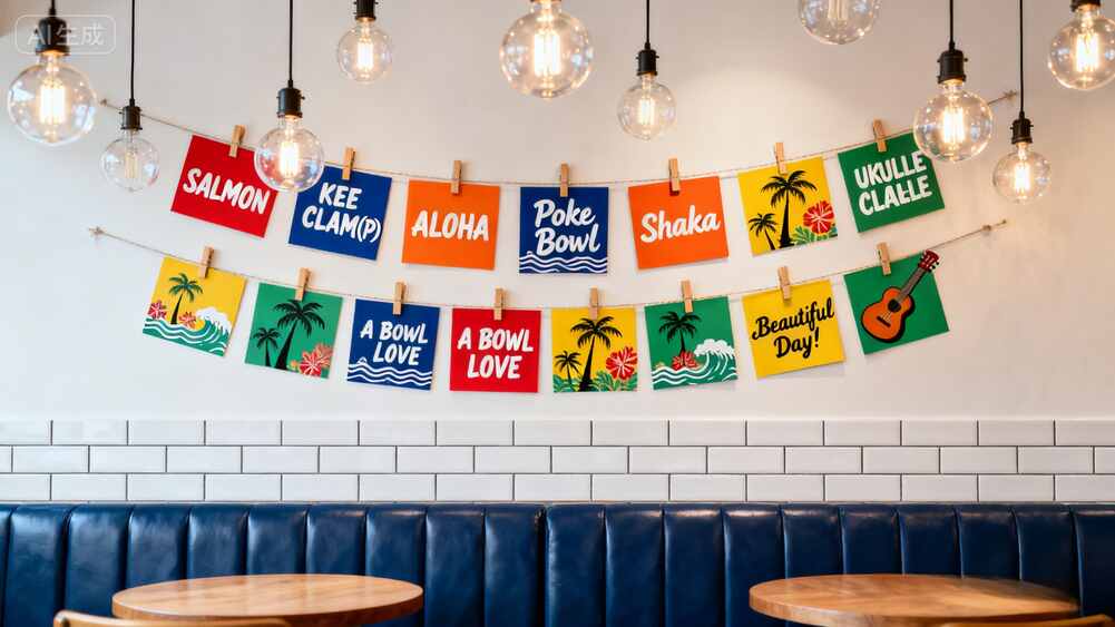 墻上那張海報才是靈魂所在!"Poke Makes My Day Everyday"這句話簡直寫到打工人心坎里了,配上誘人的波奇碗圖片,看著就讓人食欲大開。右上方那個復(fù)古燈泡更是點睛之筆,暖黃光線灑下來,連水泥墻都變得溫柔起來。