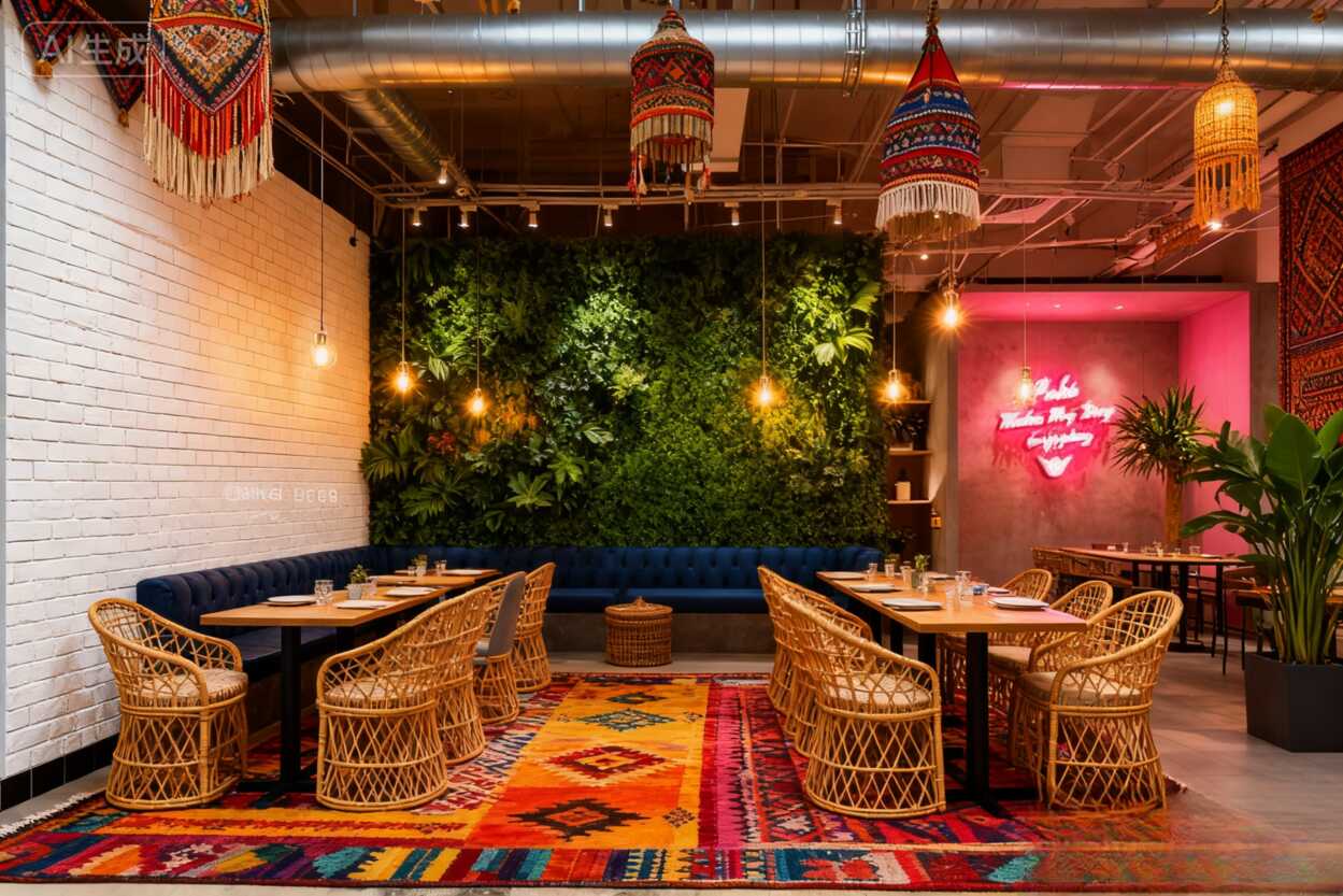 絕了!民族風地毯+霓虹招牌,這家餐廳軟裝設計讓我想直接抄作業!