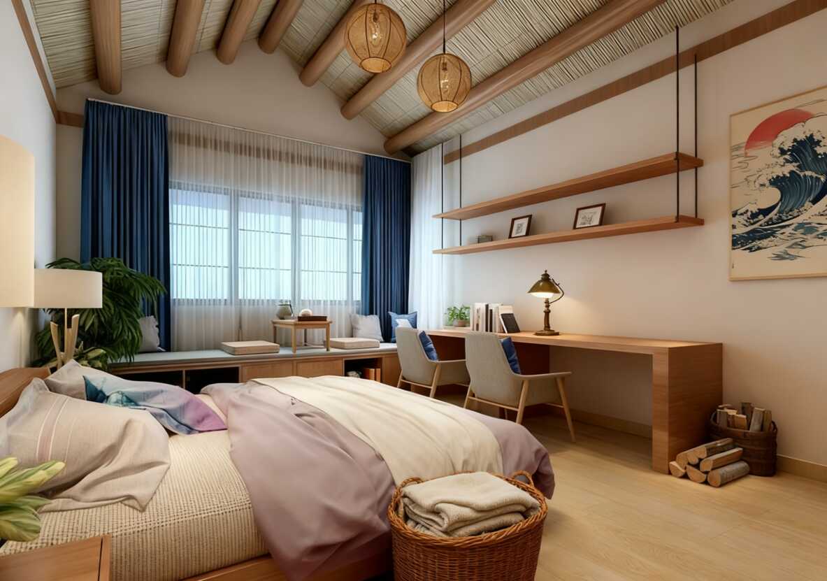 ***絕的是屋頂的設計,木質橫梁搭配竹編質感的頂面,躺在被窩里就像住進了山野間的小木屋,安全感和松弛感直接拉滿,一覺睡到自然醒不是夢!