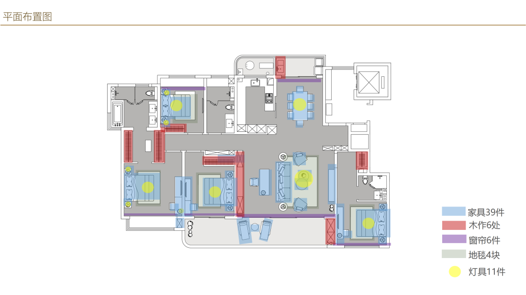軟裝產品數量分析圖,軟裝區(qū)別于硬裝的是,軟裝是需要有產品落地的,我們能看出來,家具大致需要39件,木作大致6處,窗簾大致需要6處,地毯大概需要4塊,燈具大致在11件。