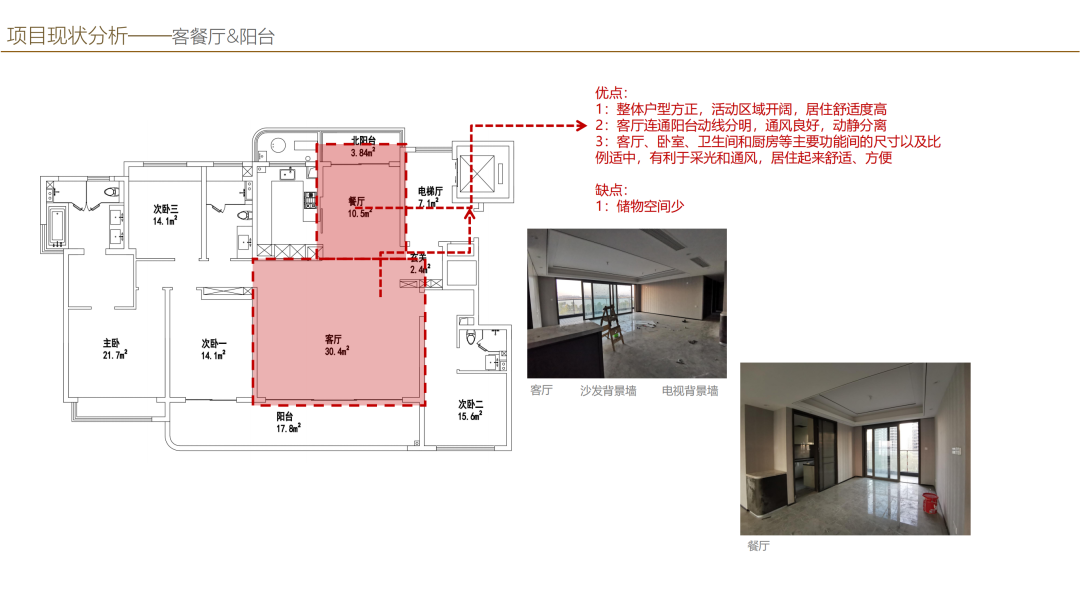 客餐廳以及陽臺是一個將南北連在一起的空間,整個空間還是相對比較方正的,活動區(qū)也是比較寬闊,在這個空間里邊舒適度來講也是還不錯的。