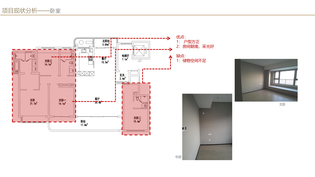 主臥、次臥以及北邊的多功能房和書房,整個來講采光和通風是還是不錯的,但是比方說南邊的臥室,相對來講空間上面是比較的局促的,如果我們后期再選擇家具產品,可能是要嚴格去把控尺寸。